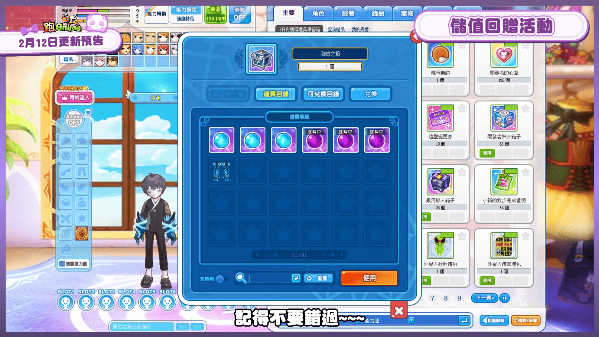 儲值回饋活動重磅回歸!玩家在2月16日前累積儲值達指定點數,即可獲贈「糯米糖餅」,這次為大家準備了豐厚福利:指定角色兌換券:補齊你的角色收藏!海嘯之箱:內含頂級SSS裝備,讓你戰力再升級!