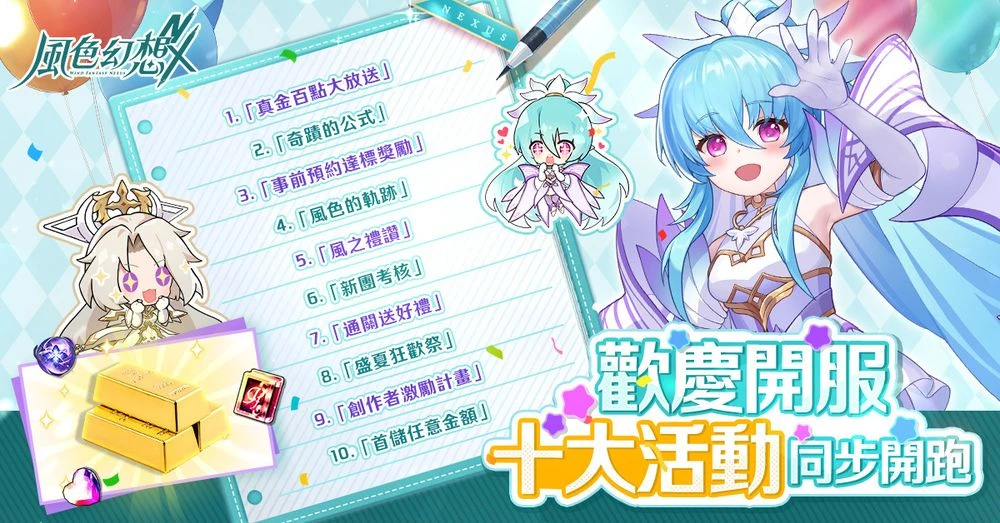 官方推出歡慶上市十大活動,玩家可領取 VTuber 角色自選券、數名 SSR 角色以及超過 250 抽福利。活動包括「真金百點大放送」、「風之禮讚」提升至指定等級,即可獲得多重獎勵;凡完成「通關送好禮」即可獲得 100 抽、「奇蹟的公式」1.0 版本任務也將抽出大量 VTuber 及遊戲周邊;另有「事前預約達標獎勵」、「風色的軌跡」、「新團考核」、「盛夏狂歡祭」、「創作者激勵計畫」相當多元的遊戲活動內容,提供 VTuber 自選卷、SSR 安潔妮、SSR 帕魯瑪、SSR 奧斯卡、萬元虛寶大獎等。活動詳情請前往官方網站及 FB 粉絲團查看。