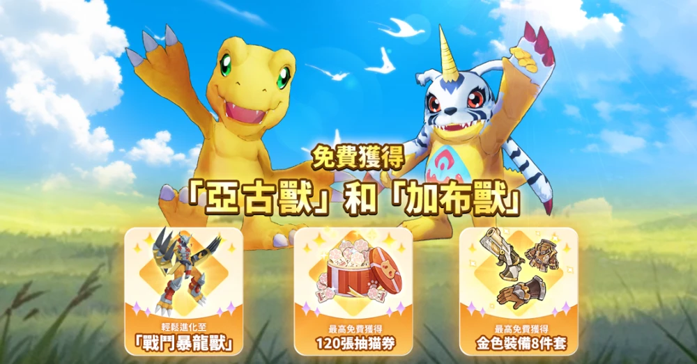 數碼寶貝化身貓靈正式加入諾恩大陸!透過參與【進化吧!亞古獸】活動可免費獲得聯動貓靈亞古獸。透過聯動主線劇情可免費獲得亞古獸。參與【進化吧!亞古獸】活動,獲得進化道具,可以投餵亞古獸幫助牠成長,同時解鎖亞古獸的進化形態,最高可免費進化至紅色貓靈「戰鬥暴龍獸」。