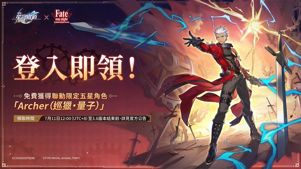 官方指出,《崩壞:星穹鐵道》自 2024 年在 2.4 版本預覽直播和 Gamescom Opening Night Live 2024 上宣布將與 Fate/stay night [Unlimited Blade Works] 合作以來,該聯動的具體資訊現在得到了進一步的消息。官方於 5 月 3 日宣布遊戲聯動主題活動「美夢與聖盃」將於 7 月 11 日正式上線,Archer 與 Saber 將作為可操控角色登場,在實現夢幻聯動的同時,亦將助力玩家後續的開拓之旅。且值得留意的是,在聯動活動開始後,開拓者登入遊戲即可免費領取限定合作五星角色「Archer(巡獵・量子)」。