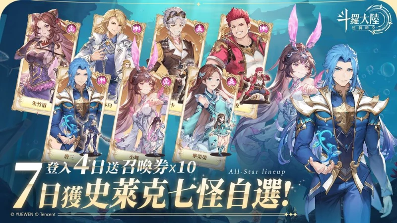 在享受福利與雙型態魅力之餘,迎新活動也不會錯過。首先登場的是七天登入活動「迎新豪禮」,除了能獲得 20 抽、千年魂環等獎勵,還能在第七日獲得史萊克七怪自選!躺著就加速七怪全收集!!