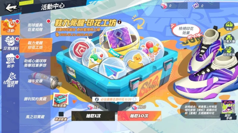 除了時裝要帥,鞋子當然也不能錯過!《全明星街球派對》因應街球手期待,推出新一期「鞋力覺醒・印花工坊」,即日起至 2025 年 6 月 3 日限時登場,多款潮流印花限時亮相,最多 20 抽必得主題印花!這次特別以「童趣」為主題,集結氣球、紙飛機、冰淇淋、黃色小鴨等輕鬆俏皮的設計,透過印花彩繪功能,讓每一雙球鞋都能化身為你的個性載體!