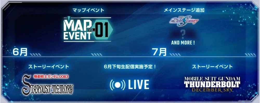 官方表示,如同過去直播中所述,預計將於 6 月下旬至 7 月上旬期間追加主要關卡《機動戰士鋼彈 SEED DESTINY》,同時亦預計追加另一部作品。有關另一部作品的情報預計會在下一次直播公開。此外,故事事件《機動戰士鋼彈 雷霆宙域戰線 DECEMBER SKY》預計登場時間將變更至 7 月中旬。