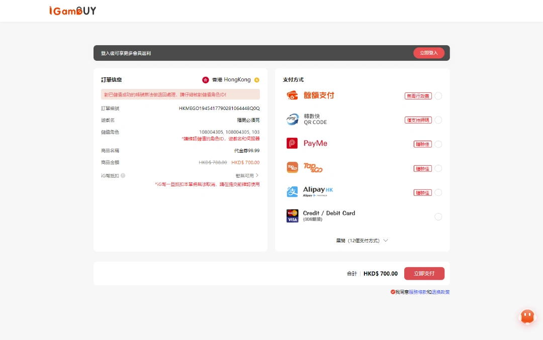 4. 點擊任意付款渠道,登入或註冊「iGameBUY會員帳號」