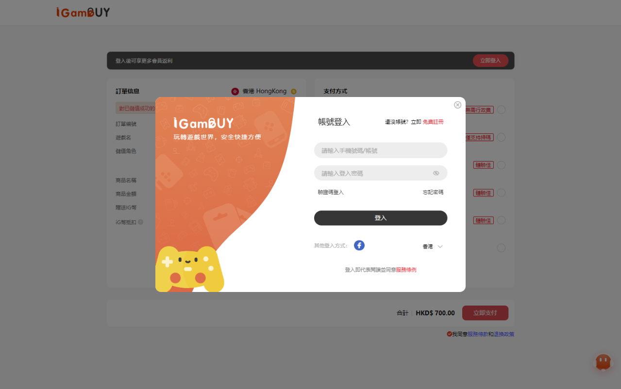 4. 點擊任意付款渠道,登入或註冊「iGameBUY會員帳號」