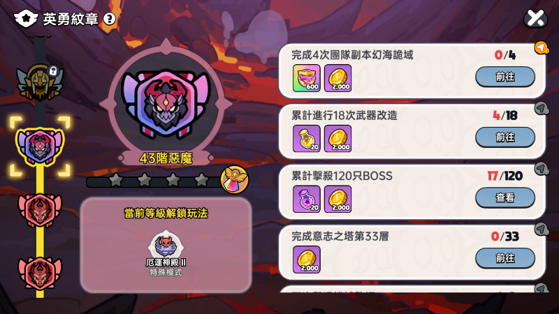 在《英勇之地》中,紋章不只是等級的代表,更象徵著玩家在冒險旅途中的成長與實力。遊戲將玩家的等級劃分為 15 階紋章段位,從「菜鳥」「狡兔」「靈鹿」一路推進到「神王」。每晉升一階,除了能解鎖新玩法、開啟挑戰副本外,也能領取對應獎勵。
