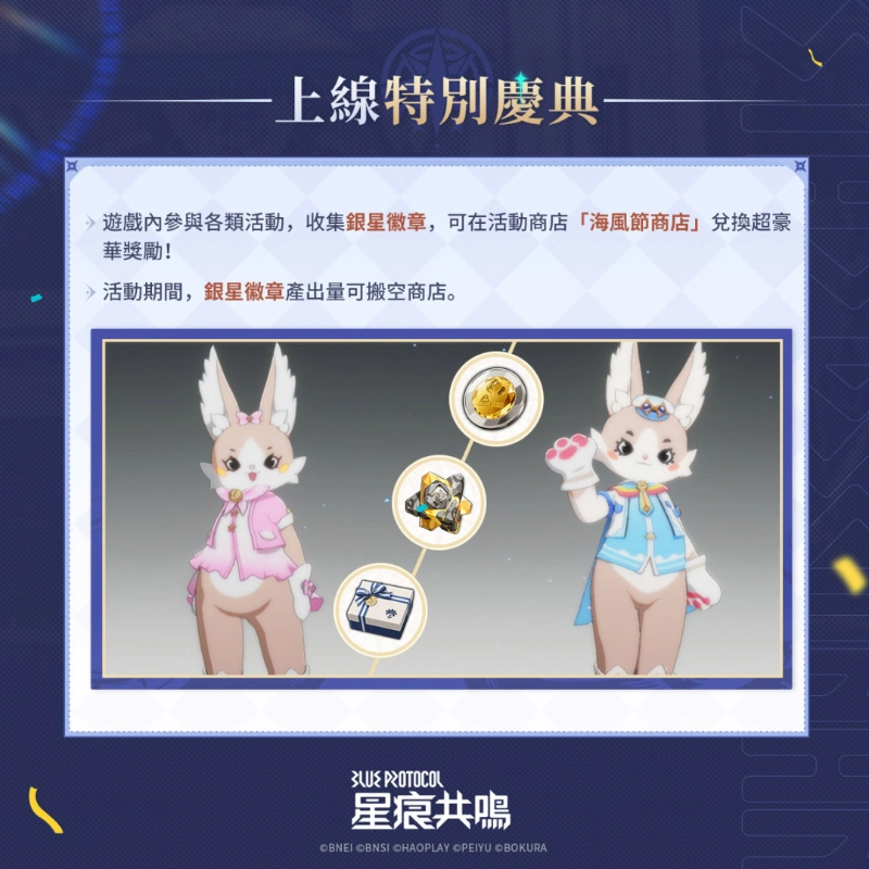 遊戲開服同步開啟「銀星遊園會」活動,在遊戲內參與各類遊園會活動,與朋友們相約慶祝,收集「銀星徽章」把「拉布喵.套裝」、「維塔喵.套裝」等等獎品帶回家!