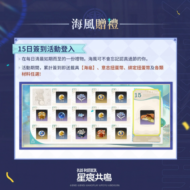 《星痕共鳴》開服同步推出七天集郵活動,即日起每天登入即可領取「載具【特快飛兔.快樂】」、「軟綿綿的夢.禮盒」等好禮。不僅如此,10 月 30 日將開啟「海風贈禮」簽到活動,累積登入十五天即可領取「載具【海龜】」、「意志扭蛋幣」、「綁定扭蛋幣」等諸多好禮。