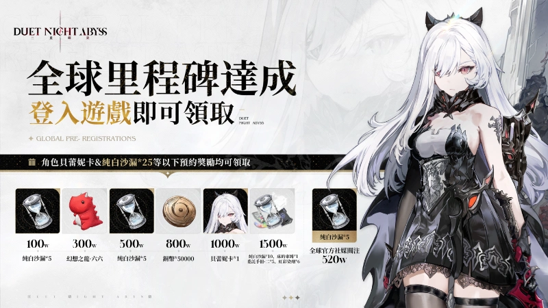截至上線前,《二重螺旋》全球預約人數已突破 1,500 萬。爲感謝玩家支持,所有玩家可透過遊戲內郵件領取限定角色「貝蕾妮卡」、25 個純白沙漏與其他養成素材及外觀道具。此外,完成遊戲任務還可免費解鎖 7 位高品質角色。