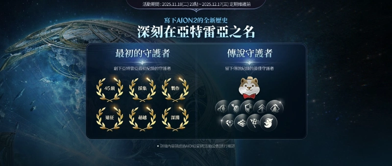 .《AION 2》攜手全家便利商店推出限時形象主題店,11/26~12/23,台北成都店(天族)及高雄南屏店(魔族)同步登場。至活動網頁為支持的陣營應援,即可獲得超值虛寶,應援獲勝陣營還可加碼抽全家 100 元購物金、《AION 2》毛巾衣及店長親筆簽名照。並將於 11/30 舉辦一日店長快閃活動,邀請玩家到場共襄盛舉。更多活動資訊將陸續公布,敬請關注官方消息。