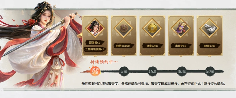 目前預約活動已火熱開啟,除了能獲得遊戲中的基礎資源「銅幣」之外,還有機會領取珍貴貨幣「通寶」、「銀兩」及抽卡道具「求賢令」。現在預約,上線即送「五星將領虞姬」與「專屬頭像框」,各檔位獎勵可疊加,讓君主們開局即獲得名將協助,讓你的征戰之路如虎添翼,旗開得勝!