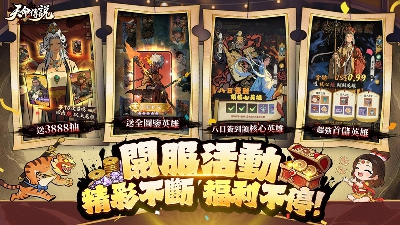 •打破逼課,全圖鑑英雄免費送:告別傳統卡牌遊戲的缺卡焦慮!透過新服專屬的活躍活動,玩家可免費集齊遊戲內所有英雄。無論是T0級人權角還是限定神將,通通能夠收入囊中,真正實現「眾神歸位」。