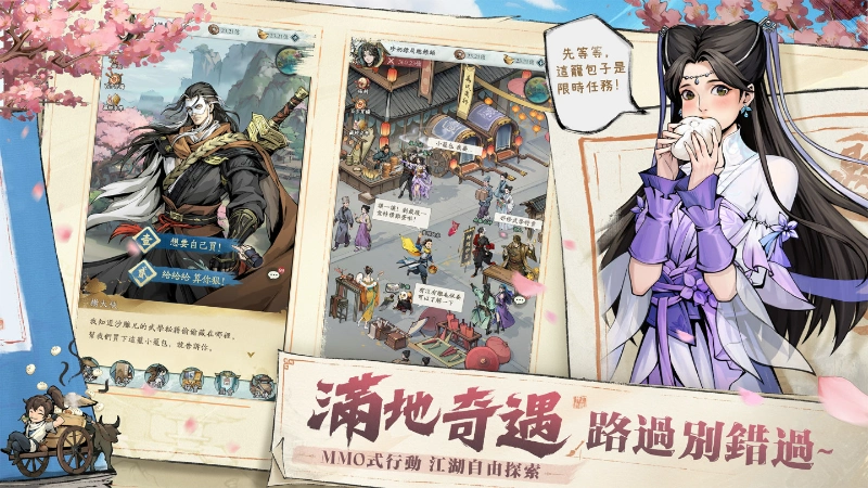 話雖如此,這異世江湖來都來了,肯定要好好體驗一下江湖奇遇!遊戲採用MMO式自由行動模式,玩家可以自由隨心探索。在這個「不正經」的江湖處處暗藏玄機,轉角可能就會遇到未知的驚喜!或許會一不小心碰見雕兄在偷偷了解雕毛保養套餐;因為幫楊大俠買了籠小籠包,竟得知曠世武學秘笈的下落;隔壁街還有一個無敵老師在暗中購入邪修武學秘笈......在這裡,只有想不到,沒有遇不到的奇遇,快來觸發你的江湖奇遇吧!