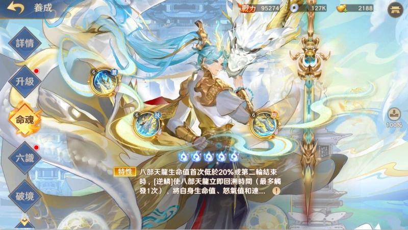 作為首位神魔LR神將,其最大的特別之處,便是擁有額外的強力限定技能。八部天龍主要依靠[逆鱗]和[龍威]這兩種機制進行戰鬥。[龍威]能使攜帶者降低攻擊、防禦和最大生命值,而[逆鱗]在累計獲得10層時,便能立即釋放1次限定技,對敵人造成物理傷害,並有機率無視目標閃避、格擋和免疫。