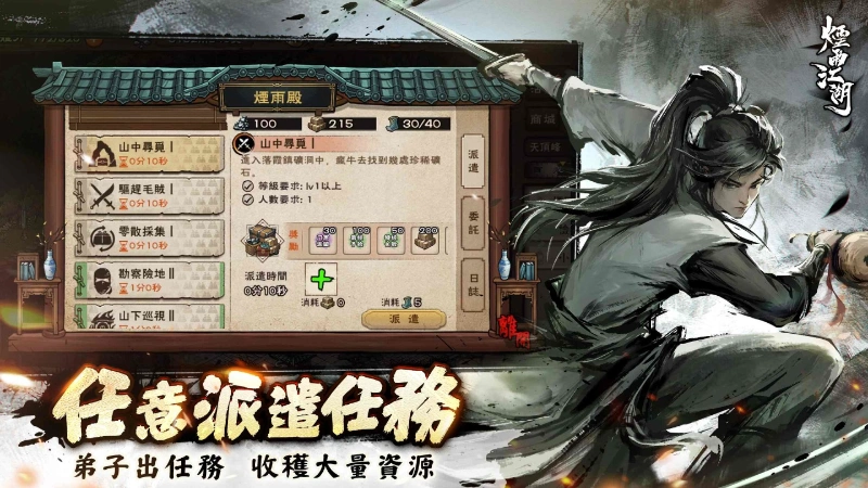 而在門派經營玩法中,資源的取得同樣至關重要。在「煙雨殿」中,掌門可依照弟子的天賦與能力,指派適合的任務,讓門派獲得各種發展所需的資源。若弟子在外執行任務時遭遇危機,掌門甚至需要親自下山馳援。在此門派系統中,大俠不再只是闖蕩江湖的俠客,更是門派的領袖與依靠。每一次決策與安排,都可能影響門派的發展方向與未來命運。