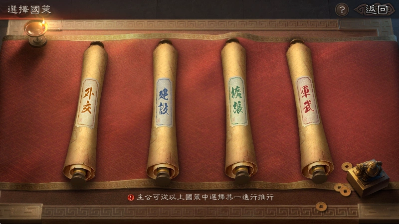 為深化策略運用,全新 「國策系統」 將成為賽季關鍵。主公依據發展方針,於外交、建設、擴張、軍武四大國策中擇一啟動,獲得專屬加成。