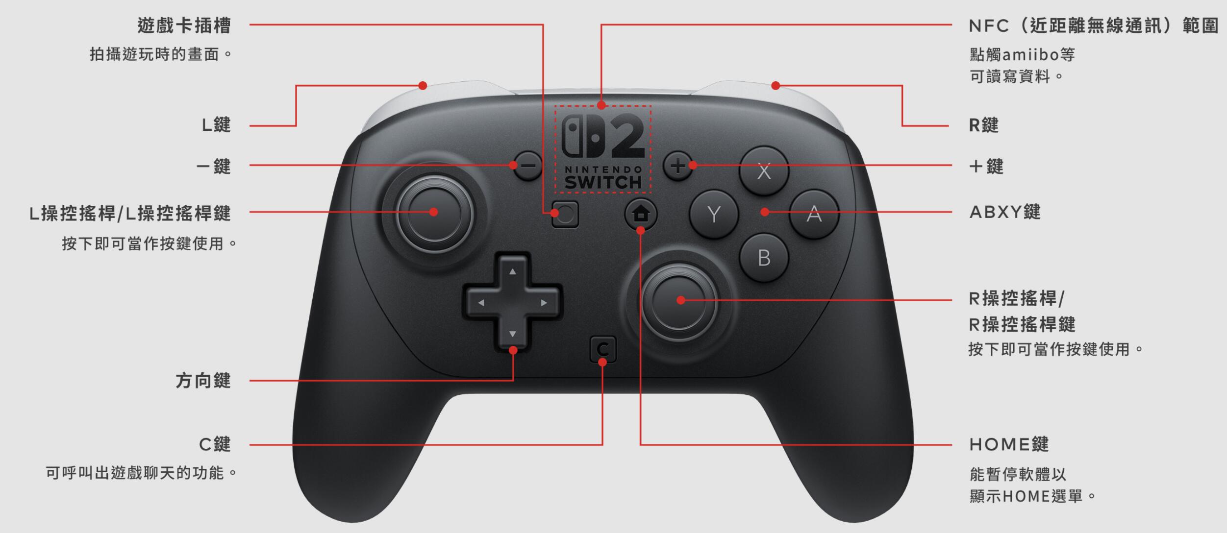 配備隨時可以呼叫出遊戲聊天的「C鍵」、可設定成任意按鍵的「GL/GR鍵」及耳機麥克風插孔等。支援與Joy-Con 2一樣的HD震動2,可以體驗細緻的觸感。推動操控搖桿時發出的聲音微小,加上控制器整體採用無接縫式構造,順滑的握持感讓操作更舒適。