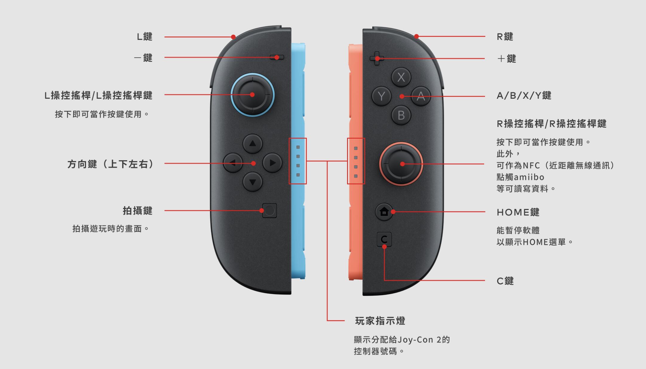 包含「Joy-Con 2(L)」、「Joy-Con 2(R)」及2條「Joy-Con 2腕帶」的組合。遊玩支援軟體時,即使只有一台主機也能多人進行對戰或合作遊玩。