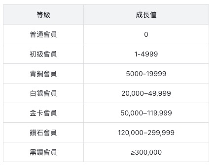 會員可透過每月消費累積成長值,系統將依據成長值表現判定會員等級。